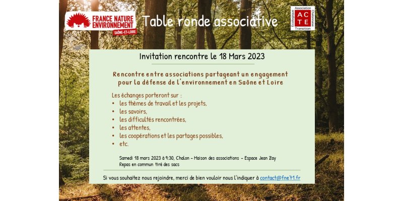 Co-organisée avec ACTE Chalon, une table ronde réunira le 18 mars 2023 à partir de 9:30 les associations adhérentes à FNE 71 et les associations avec lesquelles FNE 71 travaille régulièrement en étroite collaboration.